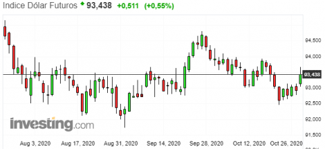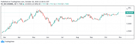 No Brasil a moeda sobe acompanhando o exterior e supera os R$5,79 na máxima do dia. O dólar abriu com leve alta e disparou para a máxima logo na primeira hora de pregão, perdendo força somente após o Banco Central intervir com leilão de US$ 1,042 bilhão à vista. O Comitê de Política Monetária (Copom) anuncia hoje, após o fechamento dos mercados, a decisão da taxa básica de juros da economia, com expectativa de manutenção da meta da Selic em 2% ao ano. O Índice de Confiança da Indústria (ICI) subiu 4,5 pontos em outubro, alcançando 111,2 pontos, para o maior nível desde abril de 2011 segundo a Fundação Getulio Vargas. O Nível de Utilização da Capacidade instalada (NUCI) subiu de 78,2% para 79,8%, maior valor desde novembro de 2014.