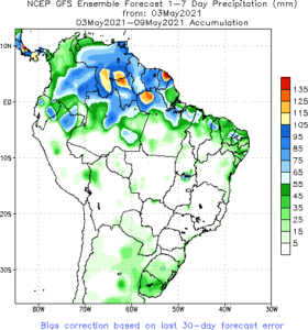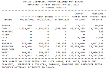Os embarques semanais de soja dos EUA foram de 143 mil toneladas na semana encerrada no dia 29 de abril, contra 284 mil da semana anterior e 381 mil do mesmo período do ano passado. Na temporada 2020/21 os embarques de soja dos EUA somam 55,46 milhões de toneladas, contra 33,78 milhões do mesmo período da temporada anterior. Os embarques de milho foram de 2,14 milhões de toneladas, contra 1,95 milhão da semana anterior e 1,35 milhão do mesmo período de 2020. Na temporada os embarques de milho dos EUA somam 43,37 milhões de toneladas, contra 23,77 milhões do mesmo período da temporada 2019/20.