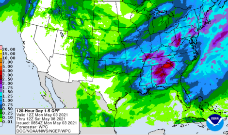 Previsão de Precipitação EUA, 5 dias, em polegadas.