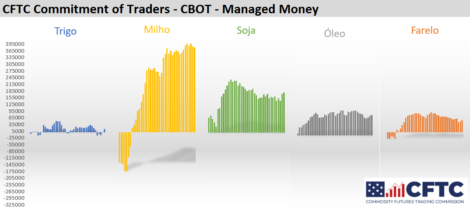Os fundos foram majoritariamente compradores de soja e trigo, e vendedores de milho na CBOT na semana encerrada no dia 27 de abril, segundo o relatório de Comprometimento de Traders (COT). Na soja os fundos aumentaram as posições compradas em 7.470 contratos, a 180.014 contratos. No milho os fundos reduziram as posições compradas em 5.336 contratos, a 378.663 contratos. No trigo as posições compradas foram aumentadas em 11.816 contratos, a 13.399 contratos.