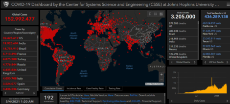 O número de mortos em todo o mundo causados pelo novo coronavírus (COVID-19) subiu para 3.205.019 hoje, de 3.169.019 até sexta-feira, com 152.992.477 casos confirmados. Desde sexta-feira são mais de 2.300.000 novos casos confirmados. O número de recuperados da pneumonia causada pelo vírus chegou a 89.742.160, de 87.715.095 até sexta-feira.