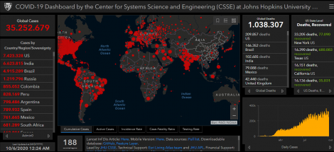 O número de mortos em todo o mundo causados pelo novo coronavírus (COVID-19) subiu para 1.038.037 hoje, de 1.024.739 até sexta-feira, com 35.252.679 casos confirmados. Desde sexta-feira são pouco mais de 850.000 novos casos confirmados em todo o mundo. O número de recuperados da pneumonia causada pelo vírus chegou a 24.549.756 hoje, de 23.905.675 até sexta-feira.