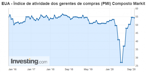 O setor de serviços dos EUA medido pelo Índice de Gestores de Compras de Serviços (PMI) da IHS Markit subiu para 54,6 em setembro, de 55 em agosto. O PMI Composto, que engloba os serviços e manufatura, caiu de 54,6 em agosto para 54,3 em setembro.