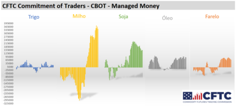 Os fundos foram grandes vendedores de commodities na CBOT na semana encerrada no dia 2 de fevereiro, segundo o relatório de comprometimento de traders (COT). Os fundos venderam 325 contratos de soja, reduzindo as posições compradas a 156.265 contratos. No milho os fundos venderam 19.082 contratos, a 345.147 contratos. No trigo os fundos venderam 1.391 contratos, a 19.884 contratos. No óleo de soja as posições compradas foram reduzidas em 1.404 contratos, a 105.930 contratos. No farelo de soja as posições compradas foram reduzidas em 7.079 contratos, a 67.511 contratos.
