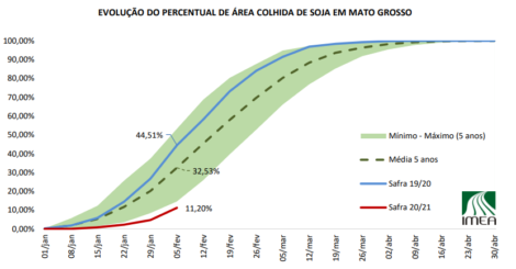 A colheita de soja 2020/21 no Mato Grosso atingiu 11,20%, contra 44,51% do mesmo período do ano passado e 32,53% da média dos últimos 5 anos, segundo o IMEA.