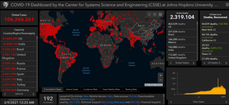 O número de mortos em todo o mundo causados pelo novo coronavírus (COVID-19) subiu para 2.319.104 hoje, de 2.271.794 até sexta-feira, com 106.246.361 casos confirmados. Desde sexta-feira são mais de 1.200.000 novos casos confirmados. O número de recuperados da pneumonia causada pelo vírus chegou a 59.263.910, de 58.423.328 até sexta-feira.