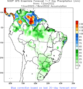 Previsão de Precipitação Brasil, 7 dias, em milímetros.