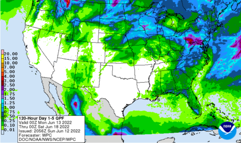 Previsão de Precipitação EUA, 5 dias, em polegadas.