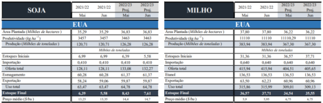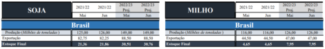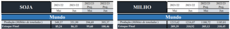Para o Brasil a estimativa de produção de soja 2021/22 foi elevada em 1 milhão de toneladas, para 126 milhões de toneladas, enquanto a estimativa de produção 2022/23 permaneceu em 149 milhões de toneladas. No milho os números ficaram inalterados, com a estimativa de produção 2021/22 em 116 milhões de toneladas e a estimativa de produção 2022/23 em 126 milhões de toneladas.