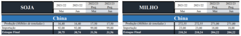 No quadro da China o USDA manteve os números inalterados, com a estimativa de importação de soja 2021/22 em 92 milhões de toneladas e a estimativa de importação de soja 2022/23 em 99 milhões de toneladas