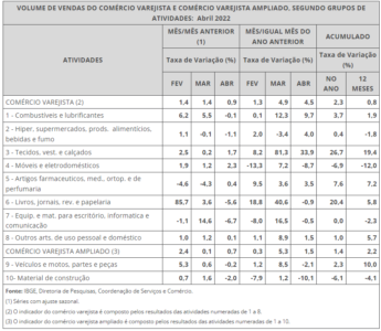 A variação de 0,9% no volume de vendas do comércio varejista, na passagem de março para abril de 2022, na série com ajuste sazonal, teve, em termos setoriais, equilíbrio entre taxas no campo negativo e taxas no campo positivo: Móveis e eletrodomésticos (2,3%), Tecidos, vestuário e calçados (1,7%), Artigos farmacêuticos, médicos, ortopédicos e de perfumaria (0,4%) e Outros artigos de uso pessoal e doméstico (0,1%) tiveram resultados positivos. Já Combustíveis e lubrificantes (-0,1%), Hiper, supermercados, produtos alimentícios, bebidas e fumo (-1,1%), Livros, jornais, revistas e papelaria (-5,6%) e Equipamentos e material para escritório informática e comunicação (-6,7%) tiveram variações no campo negativo. Para o varejo ampliado, tanto a atividade de Veículos, motos, partes e peças (-0,2%) quanto de Material de Construção (-2,0%) tiveram resultados negativos.