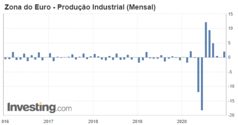A produção industrial da zona do euro subiu 2,1% em outubro ante setembro, após alta de 0,1% em setembro, segundo a Eurostat. Na comparação anual a indústria teve recuo de 3,8%, após recuo de 6,3% em setembro. Os resultados vieram melhores do que o esperado pelo mercado.