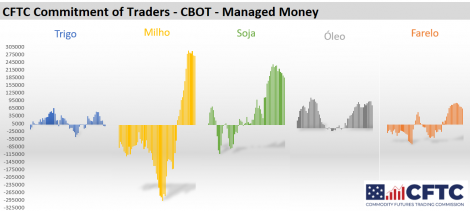 Os fundos foram majoritariamente vendedores de commodities na CBOT na semana encerrada no dia 8 de dezembro, segundo o relatório de comprometimento de traders (COT). Na soja os fundos reduziram as posições compradas em 9.028 contratos, a 185.655 contratos. No milho os fundos reduziram as posições compradas em 1.050 contratos, a 269.583 contratos. Os fundos aumentaram as posições vendidas no trigo em 1.293 contratos, a 5.692 contratos. As posições compradas no óleo de soja foram reduzidas em 15.652 contratos, a 89.063 contratos. No farelo de soja as posições compradas foram reduzidas em 7.744 contratos, a 62.642 contratos.