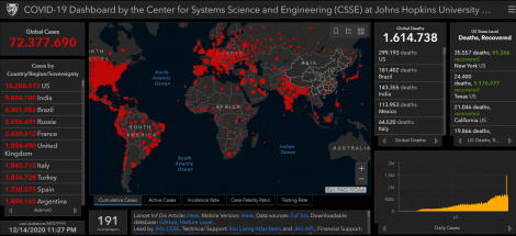 O número de mortos em todo o mundo causados pelo novo coronavírus (COVID-19) subiu para 1.614.738 hoje, de 1.587.024 até sexta-feira, com 72.377.690 casos confirmados. Desde sexta-feira são mais de 2.500.000 novos casos confirmados em todo o mundo. O número de recuperados da pneumonia causada pelo vírus chegou a 47.360.708 hoje, de 45.051.149 até sexta-feira.