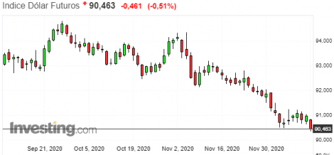 O dólar segue em baixa frente a outras moedas. Menos de dois dias depois que a Administração de Alimentos e Medicamentos dos EUA (FDA) concedeu autorização de emergência para a vacina COVID-19 da Pfizer em parceria com a BioNTech, quase três milhões de doses da vacina foram transportadas em todo o país. É parte de uma missão histórica de vacinar mais de 100 milhões de pessoas até o final de março, com 145 locais nos EUA prontos para receber a vacina hoje e quase 500 locais definidos para receber suas primeiras doses na terça e quarta-feira