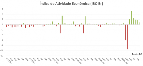 No Brasil a moeda passa a subir após chegar a R$5,01 na mínima do dia. Na sexta-feira a moeda subiu 0,14%, a R$5,0446, acumulando baixa de 1,54% na semana. O Banco Central realizou hoje leilão de 16 mil contratos de swap cambial tradicional para rolagem de contratos com vencimento abril e setembro de 2021. O Índice de Atividade Econômica (IBC-Br), considerado uma “prévia” do Produto Interno Bruto (PIB), teve alta 0,86% em outubro ante setembro, após alta de 1,68% em setembro, em dados ajustados sazonalmente, segundo o Banco Central. Na comparação com outubro do ano passado o indicador registrou uma contração de 2,61%. No acumulado dos dez primeiros meses deste ano o IBC-Br registra retração de 4,92%, e no acumulado dos últimos 12 meses até outubro de 2020, houve queda de 3,93%, dados sem ajuste sazonal.