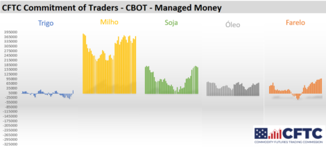 Os fundos foram majoritariamente compradores de commodities na CBOT na semana encerrada no dia 8 de março, segundo o relatório de comprometimento de traders (COT). Na soja os fundos venderam 4.007 contratos, reduzindo as posições compradas para 171.714 contratos. No milho os fundos aumentaram as posições compradas em 19.561 contratos, para 368.784 contratos. No trigo os fundos passaram de 7.036 posições vendidas para 20.208 posições compradas. No óleo de soja as posições compradas foram aumentadas em 4.239 contratos, para 85.669 contratos, e no farelo as posições compradas foram aumentadas de 94.829 contratos para 96.627 contratos.