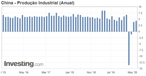 A produção industrial da China subiu 4,4% em maio na comparação anual, após alta de 3,9% em abril, a leitura mais alta desde dezembro, segundo a Agência Nacional de Estatísticas. A expectativa do mercado estava em um aumento de 5%. Já as vendas do varejo tiveram recuo de 2,8% em maio, após recuo de 7,2% de abril e acima do recuo de 2% esperado pelo mercado.