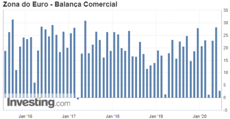 A balança comercial da zona do euro registrou superávit de 2,9 bilhões de euros em maio, ante 15,5 bilhões no ano anterior, segundo a Eurostat. As exportações tiveram recuo de 29,3% e as importações recuaram 24,8% no período. O superávit comercial da zona do euro foi de 1,2 bilhão de euros, bem abaixo dos 25,5 bilhões registrados em abril.