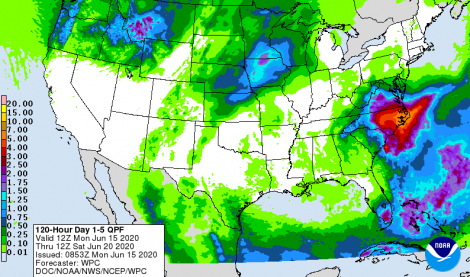 Previsão de Precipitação EUA, 5 dias, em polegadas.