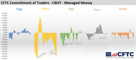 Os fundos foram grandes compradores de soja e vendedores de milho e trigo na CBOT na semana encerrada no dia 9 de junho, segundo o relatório de comprometimento de traders (COT). Os fundos aumentaram as posições compradas na soja em 13.739 contratos, a 20.376 contratos. No milho os fundos aumentaram as posições vendidas em 15.046 contratos, a 297.312 contratos. No trigo as posições vendidas foram aumentadas em 11.894 contratos, a 25.368 contratos.