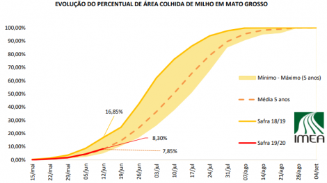 A colheita de milho no Mato Grosso atingiu 8,3% até sexta-feira, contra 16,85% do mesmo período de 2019 e 7,85% da média dos últimos 5 anos, segundo o IMEA.