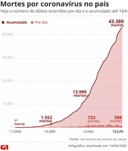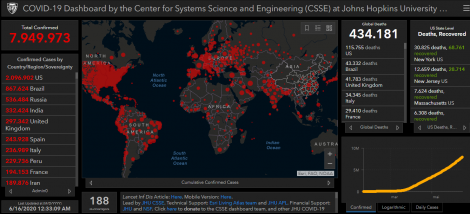 O número de mortos causados pelo novo coronavírus (COVID-19) subiu para 434.181 hoje, de 422.760 até sexta-feira, com 7.949.973 casos confirmados em 188 países e territórios. Desde sexta-feira são quase 400.000 novos casos confirmados em todo o mundo. O número de recuperados da pneumonia causada pelo vírus chegou a 3.799.143 hoje, de 3.576.097 até sexta-feira.