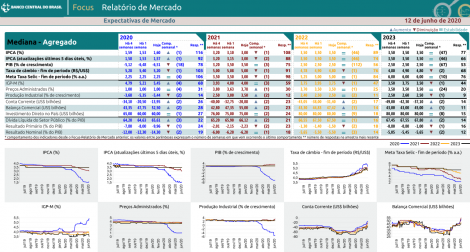 O Banco Central divulgou na manhã de hoje o novo boletim de mercado Focus, com expectativa de maior inflação e maior retração da economia para este ano. As instituições financeiras elevaram a expectativa para a inflação deste ano de 1,53% para 1,6% e elevaram a expectativa para a retração do PIB de 6,48% para 6,51%. O dólar deve encerrar o ano em R$5,20 e a meta da taxa Selic em 2,25% ao ano. Para 2021 a expectativa para a inflação caiu de 3,1% para 3% enquanto a expectativa para o crescimento do PIB permaneceu em 3,5%. O dólar deve encerrar o próximo ano em R$5,00 e a meta da Selic em 3%, redução de 0,5 ponto percentual em relação à semana anterior.
