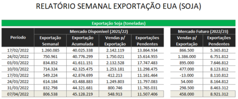 O USDA divulgou na quinta-feira o relatório de vendas semanais para exportação dos EUA, com números dentro do esperado para a soja e milho. Na semana encerrada no dia 7 de abril, as vendas de soja 2021/22 foram de 549 mil toneladas, contra 801 mil da semana anterior e 90 mil do mesmo período do ano passado. Na temporada as vendas de soja somam 56,64 milhões de toneladas, contra 60,76 milhões do mesmo período da temporada anterior. As vendas 2022/23 foram de 458 mil toneladas, acumulando 8,92 milhões de toneladas na temporada.
