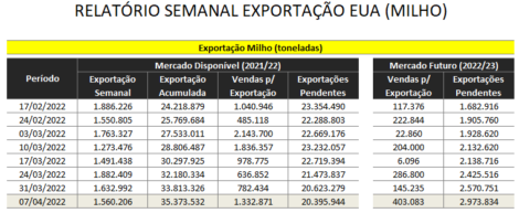 As vendas de milho 2021/22 foram de 1,33 milhão de toneladas, contra 782 mil da semana anterior e 328 mil do mesmo período de 2021. Na temporada as vendas de milho dos EUA somam 55,77 milhões de toneladas, contra 66,81 milhões do mesmo período da temporada anterior. As vendas 2022/23 foram de 403 mil toneladas, acumulando 2,97 milhões de toneladas na temporada.