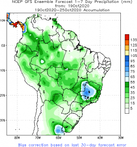 O plantio de soja 2020/21 no Brasil atingiu 6,1% até quinta-feira, contra 19,5% do mesmo período de 2019 e 17,3% da média dos últimos 5 anos, segundo a Safras & Mercado. Segundo o analista da consultoria, Luiz Fernando Roque, “o que podemos dizer sobre a soja é que deve haver replantio de algumas áreas e que a safra deve começar a entrar no mercado um pouco atrasada”.