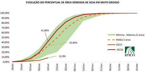 O plantio de soja no Mato Grosso atingiu 8,19%, contra 41,8% do mesmo período do ano passado e 32,84% da média dos últimos 5 anos, segundo o IMEA.