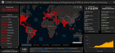 O número de mortos em todo o mundo causados pelo novo coronavírus (COVID-19) subiu para 1.115.079 hoje, de 1.100.364 até sexta-feira, com 40.186.016 casos confirmados. Desde sexta-feira são mais de 1.100.000 novos casos confirmados em todo o mundo. O número de recuperados da pneumonia causada pelo vírus chegou a 27.544.407 hoje, de 26.735.791 até sexta-feira.