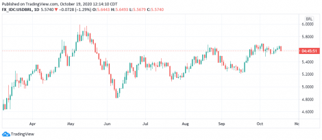 No Brasil a moeda recua acompanhando o exterior e realizando as altas recentes. Na sexta-feira a moeda subiu 0,30%, a R$5,6430, acumulando alta de 2,12% na semana. A economia brasileira registrou alta de 2,2% em agosto ante julho, segundo o Monitor do PIB-FGV, da Fundação Getulio Vargas (FGV). Na comparação anual a queda foi de 4,9%. “A economia continuou a apresentar crescimento em agosto, mantendo a trajetória de recuperação observada desde maio. No entanto, o ritmo de retomada parece ter desacelerado após o expressivo crescimento de 4,6% da economia em junho”, afirmou em nota Claudio Considera, coordenador do Monitor do PIB-FGV.