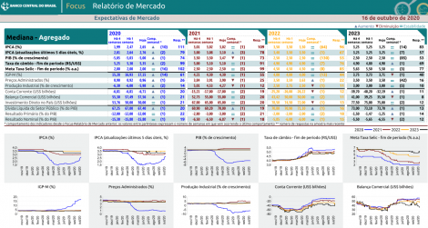 O Banco Central divulgou na manhã de hoje o novo boletim de mercado Focus, com expectativa de maior inflação e menor retração da economia para este ano. As instituições financeiras elevara a expectativa para a inflação deste ano de 2,47% para 2,65% e reduziram a expectativa para a retração da economia de 5,03% para 5,00%. O dólar deve encerrar o ano em R$5,35 e a meta da Selic em 2% ao ano. Para 2021 a expectativa para a inflação permaneceu em 3,02% e para o PIB foi reduzida de 3,50% para 3,47%. O dólar deve encerrar o próximo ano em R$5,10 e a Selic em 2,50%.