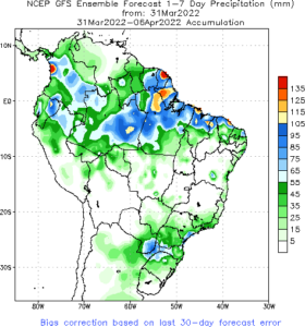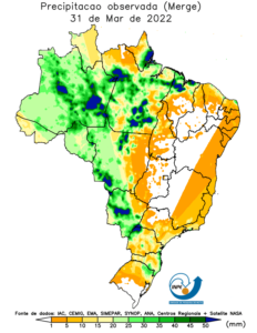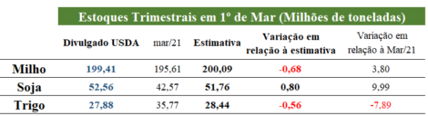 O USDA divulgou também o relatório de estoques trimestrais dos EUA em 1o de março, com números praticamente dentro do esperado. Os estoques de soja ficaram em 52,56 milhões de toneladas, 23,47% acima do mesmo período de 2021. Os estoques de milho ficaram em 199,41 milhões de toneladas, contra 195,61 milhões de março de 2021 e 200 milhões da expectativa. Já os estoques de trigo ficaram em 27,88 milhões de toneladas, 22% abaixo do mesmo período do ano passado.