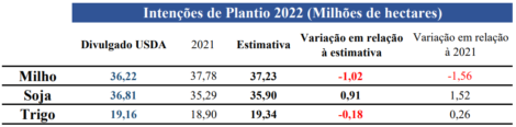 O USDA divulgou ontem o relatório de perspectivas de plantio da safra 2022/23 dos EUA, com área acima do esperado para a soja e abaixo do esperado para o milho e trigo. A área de soja deve totalizar 36,81 milhões de hectares nesta safra, abaixo dos 35,29 milhões do ano passado e 35,90 milhões da expectativa. A área de milho deve chegar a 36,22 milhões de hectares, ante 37,78 milhões de 2021 e 37,23 milhões esperados. A área de trigo total está estimada em 19,16 milhões de hectares, contra 18,9 milhões de 2021 e 19,34 milhões da expectativa.