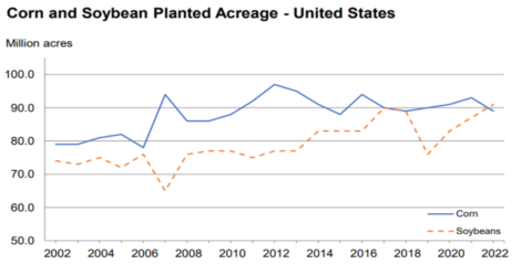 Bom dia, a Bolsa de Chicago opera mista com a soja dando sequência a queda de ontem após o USDA projetar área maior que a de milho na safra 2022/23 dos EUA.