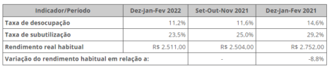 No Brasil a moeda recuou 0,57% ontem, a R$ 4,7592, acumulando baixa de 7,7% no mês e 14,63% no primeiro trimestre do ano. A taxa de desemprego no Brasil ficou em 11,2% no trimestre móvel de dezembro de 2021 a fevereiro de 2022, recando 0,4 ponto percentual em relação ao trimestre de setembro a novembro de 2021 (11,6%) e 3,4 pontos percentuais em relação ao mesmo período do ano passado, segundo o IBGE. A população desocupada (12,0 milhões de pessoas) recuou 3,1% (menos 389 mil pessoas) frente ao trimestre anterior (12,4 milhões de pessoas) e 19,5% (menos 2,9 milhões de pessoas desocupadas) em relação ao mesmo período do ano anterior (14,9 milhões de pessoas). A taxa composta de subutilização (23,5%) caiu 1,5 ponto percentual em relação ao trimestre de setembro a novembro (25%) e 5,7 pontos percentuais na comparação com o trimestre encerrado em fevereiro de 2021 (29,2%). A população subutilizada (27,3 milhões de pessoas) teve queda de 6,3% (menos 1,8 milhão) frente ao trimestre anterior (29,1 milhões) e de 17,8% (menos 5,9 milhões) na comparação anual (33,1 milhões).