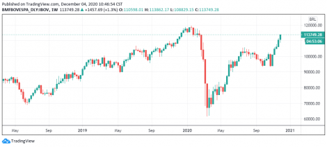 No Brasil o Ibovespa segue em alta acompanhando o exterior, acima dos 113 mil pontos. Ontem a bolsa subiu 0,37%, 112.291 pontos.