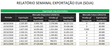 O USDA divulgou ontem o relatório de vendas semanais para exportação dos EUA, com números dentro do esperado para a soja e milho. Na semana encerrada no dia 26 de novembro, as vendas de soja 2020/21 foram de 407 mil toneladas, contra 768 mil da semana anterior e 684 mil do mesmo período do ano passado. Na temporada as vendas de soja dos EUA somam 52,34 milhões de toneladas, contra 25,94 milhões do mesmo período da temporada anterior.