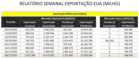 As vendas de milho 2020/21 dos EUA foram de 1,37 milhão de toneladas, contra 1,66 milhão da semana anterior e 546 mil do mesmo período do ano passado. Na temporada as vendas somam 38,29 milhões de toneladas, contra 14,62 milhões do mesmo período da temporada 2019/20.