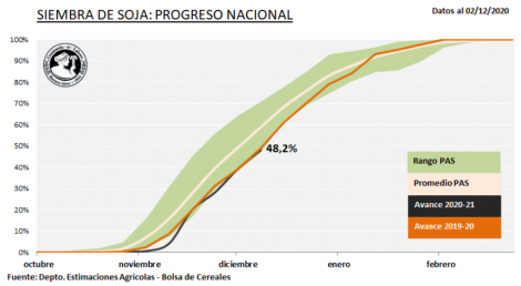 Plantio de soja 2020/21 na Argentina atingiu 48,2% dos 17,2 milhões de hectares projetados para esta safra, registrando um atraso anual de 1 ponto percentual, segundo a Bolsa de Cereales de Buenos Aires. Na semana o plantio teve avanço de 8,9 pontos percentuais. Segundo a BCBA, “as chuvas acumuladas nos últimos sete dias permitiram que os níveis de umidade fossem reconstruídos em grande parte do centro-norte do país.”