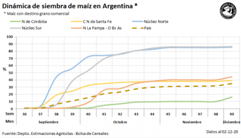 O plantio de milho 2020/21 na Argentina avançou apenas 3,1 pontos percentuais durante a última semana, para 35%, dos 6,3 milhões de hectares projetados para esta safra. No mesmo período do ano passado o plantio estava em 48,7%.