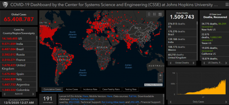 O número de mortos em todo o mundo causados pelo novo coronavírus (COVID-19) subiu para 1.509.743 hoje, de 1.496.055 até ontem, com 65.408.787 casos confirmados. Desde ontem são mais de 700.000 novos casos confirmados em todo o mundo. O número de recuperados da pneumonia causada pelo vírus chegou a 42.089.892 hoje, de 41.635.408 até ontem.