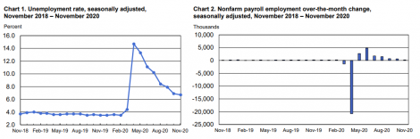 O dólar opera com leve baixa frente a outras moedas. O setor não-agrícola dos EUA criou 245 mil postos de trabalho em novembro, após criação de 610 mil em outubro (revisado de 638 mil), segundo o relatório Payroll do Departamento de Trabalho. O número veio abaixo do esperado pelo mercado, que era de 470 mil. A taxa de desemprego caiu de 6,9% para 6,7%, melhor do que os 6,8% esperados. “Essas melhorias no mercado de trabalho refletem a continuidade da retomada da atividade econômica que havia sido restringida devido à pandemia do coronavírus (COVID-19) e os esforços para contê-la. No entanto, o ritmo de melhora do mercado de trabalho moderou-se nos últimos meses. Em novembro, houve ganhos notáveis de empregos em transporte e armazenagem, serviços profissionais e comerciais e saúde. O emprego diminuiu no governo e no comércio varejista”, disse o departamento em relatório.