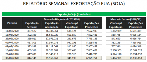 O USDA divulgou ontem o relatório de vendas semanais para exportação dos EUA, com números acima do esperado para a soja e dentro do esperado para o milho. Na semana encerrada no dia 30 de julho, as vendas de soja 2019/20 foram de 345 mil toneladas, contra 201 mil da semana anterior. Na temporada as vendas de soja dos EUA somam 46,94 milhões de toneladas. As vendas 2020/21 foram de 1,4 milhão de toneladas, acumulando 15,14 milhões de toneladas na temporada futura.