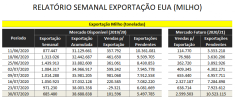 As vendas de milho 2019/20 foram de 102 mil toneladas, contra dedução de 29 mil toneladas na semana anterior. Na temporada as vendas de milho dos EUA somam 44,17 milhões de toneladas. As vendas 2020/21 foram de 2,6 milhões de toneladas, acumulando 10,52 milhões de toneladas na temporada.