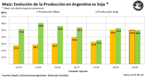 A colheita do milho 2019/20 na Argentina está finalizada, com avanço de 2,6 pontos percentuais durante a última semana, segundo a Bolsa de Cereales de Buenos Aires. Com produtividade média de 8,17 toneladas por hectare, a produção final chegou aos 50 milhões de toneladas. O plantio do trigo 2020/21 alcançou 98,3% dos 6,5 milhões de hectares projetados para esta safra.