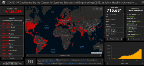 O número de mortos em todo o mundo causados pelo novo coronavírus (COVID-19) subiu para 715.681 hoje, de 708.941 até ontem, com 19.135.088 casos confirmados. Desde ontem são mais de 250.000 novos casos confirmados em todo o mundo. O número de recuperados da pneumonia causada pelo vírus chegou a 11.595.480 hoje, de 11.397.753 até ontem.